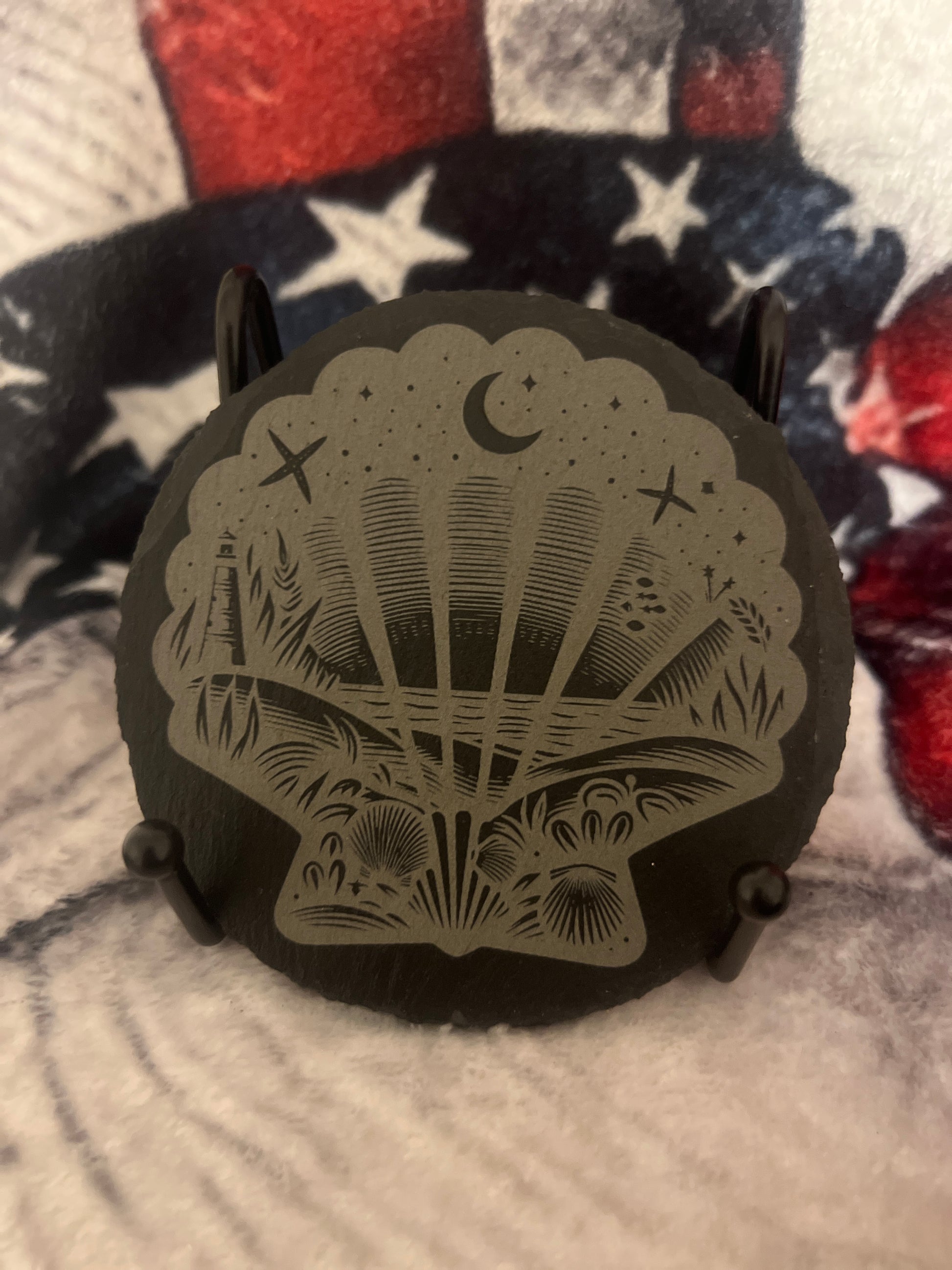 Premium 4-inch slate coaster featuring a charming Shimmering Whispers scallop design. Add a touch of marine elegance to your living space while protecting your surfaces. Each coaster is carefully crafted from natural slate with non-slip backing.